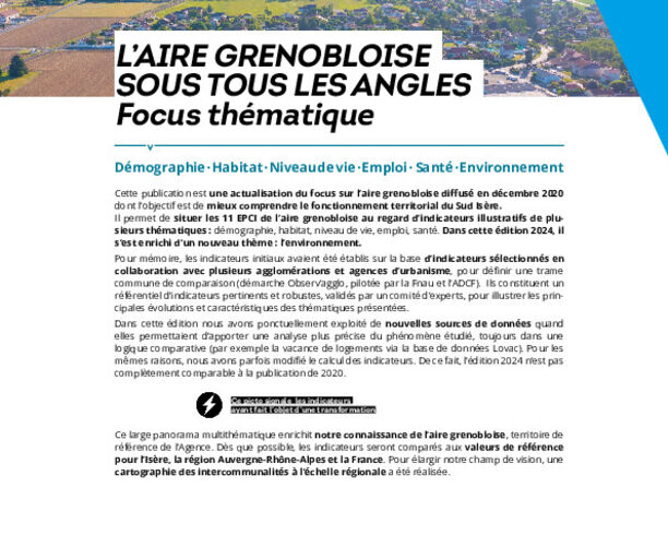 Démographie · Habitat · Niveau de vie · Emploi · Santé · Environnement Cette publication est une actualisation du focus sur l’aire grenobloise diffusé en décembre 2020 dont l’objectif est de mieux comprendre le fonctionnement territorial du Sud... -