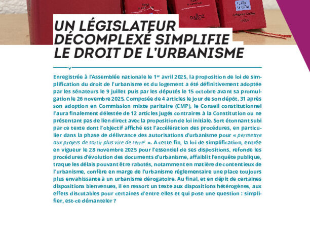 Publication12/2025Planification & Projets de territoireNote juridique : Un législateur décomplexé simplifie le droit de l’urbanisme