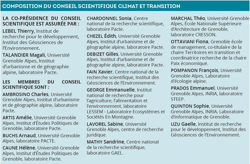Deux co-présidents scientifiques – Magali Talandier (UGA) et Thierry Lebel (Institut des géosciences et de l’environnement) - ont été désignés en 2024 par deux élus référents : le vice-président en charge du Plan air énergie climat de Grenoble Alpes Métropole (Pierre Verri) et un élu désigné par le conseil d’administration de l’Agence d’urbanisme de la région grenobloise (Philippe Cardin).
