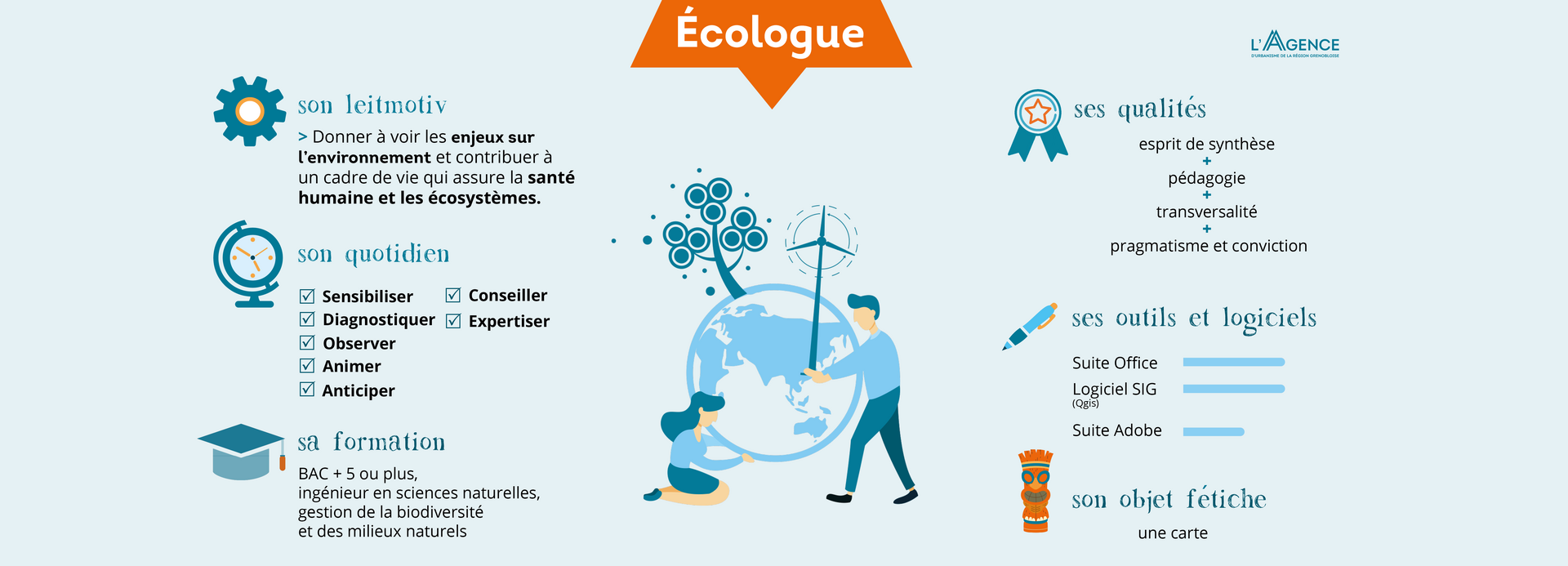 « Dans une agence d’urbanisme, l’écologue aide ses collègues et les partenaires qu’il accompagne à comprendre les enjeux environnementaux. Il les forme et les informe sur des sujets comme les risques, la trame verte et bleue... »