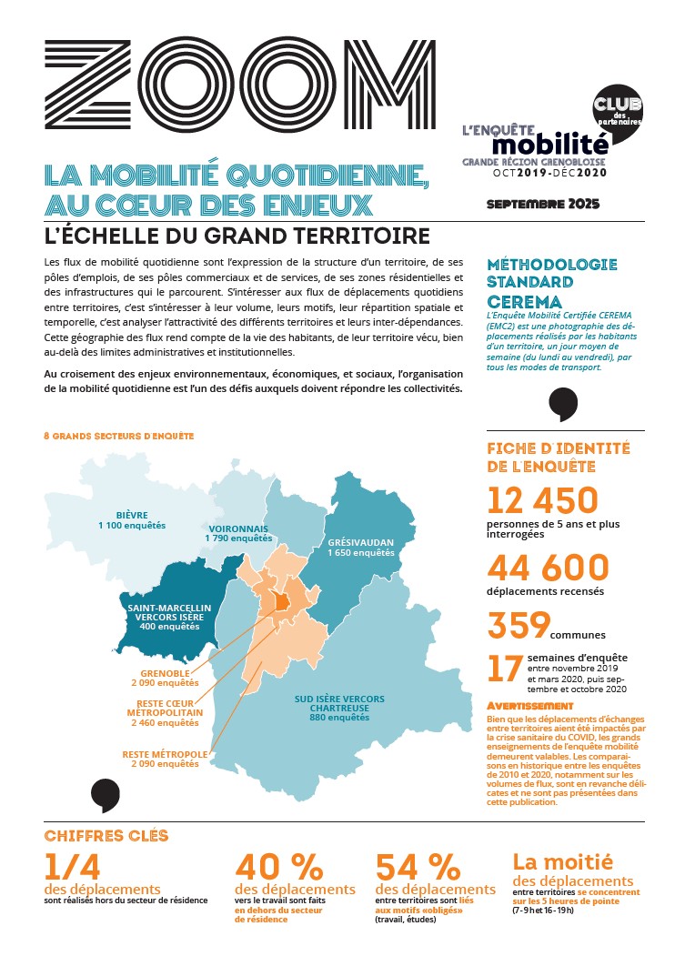 L'Agence publie le ZOOM thématique " La mobilité quotidienne au cœur des enjeux. L'échelle du grand territoire ", 6e numéro de la série dédiée à la valorisation des résultats de l'enquête Mobilité grande région grenobloise (EMC2 2019-2020).