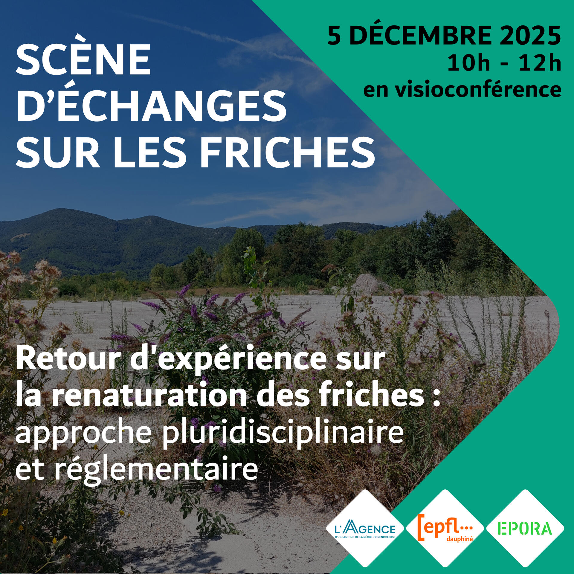 Organisée par l'Agence, l’Epfl du Dauphiné et l’EPORA, l’édition 2025 de la scène d’échanges dédiée aux friches aura lieu en visioconférence, le 5 décembre de 10h à 12h.