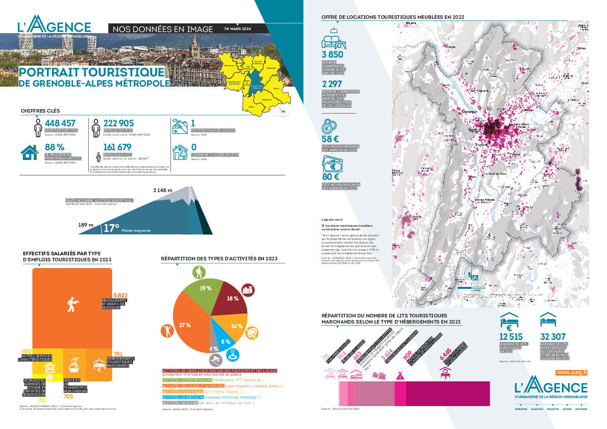 L’édition consacrée au portrait touristique de Grenoble-Alpes Métropole permet en quelques infographies de visualiser des données relatives à la population, les résidences principales et les emplois de manière générale, situant les principaux indicateurs de la « vie locale », avant de rentrer sur les champs du tourisme. Pente et altitude maxi du territoire, présence de stations/communes classées, indicateurs relatifs à l’emploi touristique… Quelle ampleur pour l’activité touristique sur ce secteur de l’aire grenobloise ? La planche contient ensuite les éléments relatifs à la caractérisation du territoire touristique autour des types d’activités présentes (Apidae), puis les volumes de mise en location de meublés touristiques (Likibu), en termes de nombre d’annonces, de prix des nuitées, et de géolocalisation de cette offre complémentaire aux lits touristiques classiques (Isère Attractivité). Ces constats sur les hébergements et les activités permettent de situer Grenoble-Alpes Métropole au regard des autres EPCI de l’aire grenobloise et du grand territoire, en fonction des spécificités portées par chacun (présence de stations, grands sites touristiques, tourisme d’affaires…).