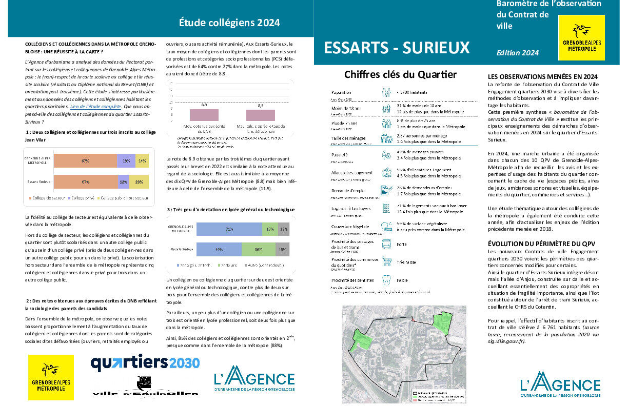 Cette première synthèse « baromètre de l’observation du Contrat de Ville » restitue les principaux enseignements des démarches d’observation menées en 2024 sur le quartier d’Essarts Surieux.