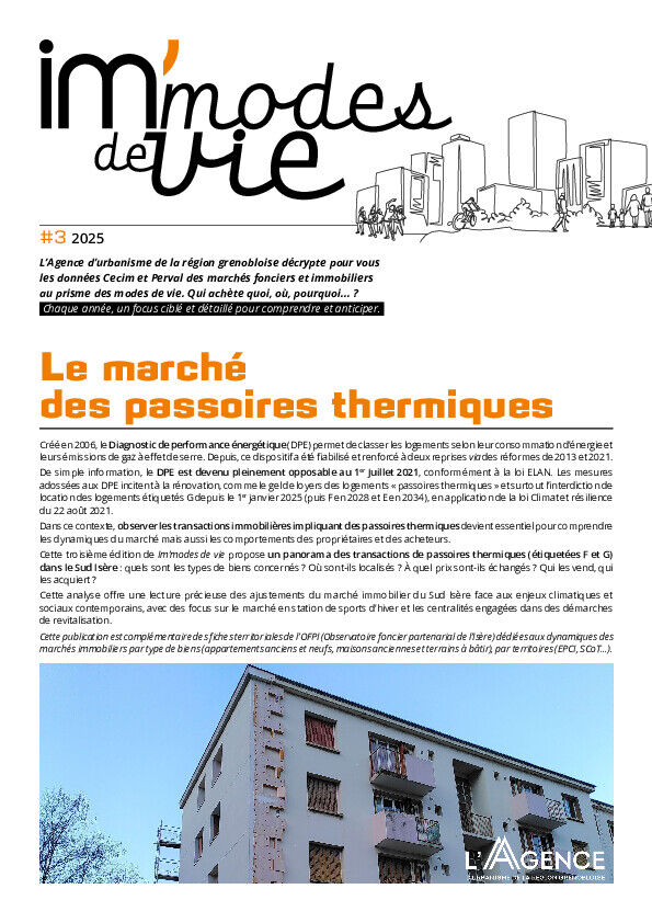 Cette troisième édition de Im’modes de vie propose un panorama des transactions de passoires thermiques (étiquetées F et G) dans le Sud Isère : quels sont les types de biens concernés ? Où sont-ils localisés ? À quel prix sont-ils échangés ? Qui les vend, qui les acquiert ?