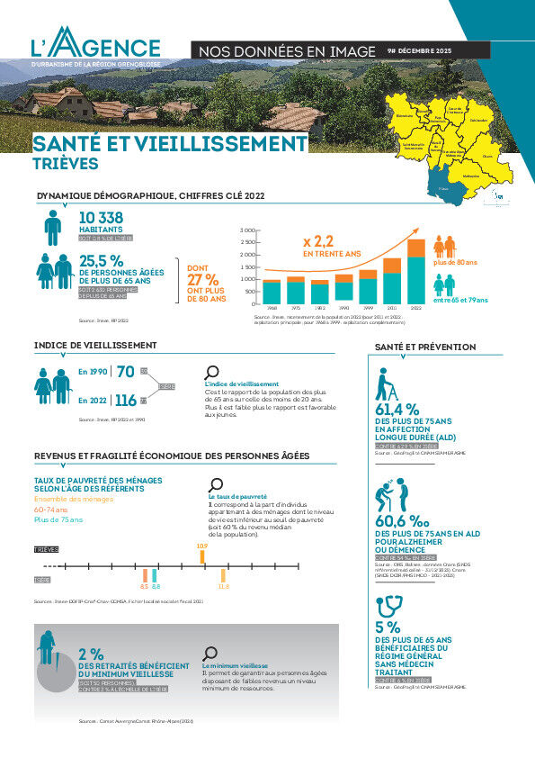 Indice de vieillissement, taux de pauvreté des ménages selon l’âge des référents, part des plus de 65 ans vivant seuls, etc. Cette neuvième édition de Nos données en images dresse le portrait actualisé du SCoT, de l’aire grenobloise et des onze intercommunalités qui la composent en matière de santé et vieillissement.