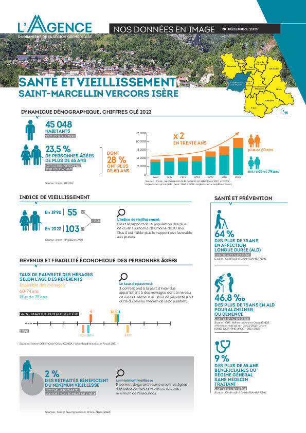 Indice de vieillissement, taux de pauvreté des ménages selon l’âge des référents, part des plus de 65 ans vivant seuls, etc. Cette neuvième édition de Nos données en images dresse le portrait actualisé du SCoT, de l’aire grenobloise et des onze intercommunalités qui la composent en matière de santé et vieillissement.