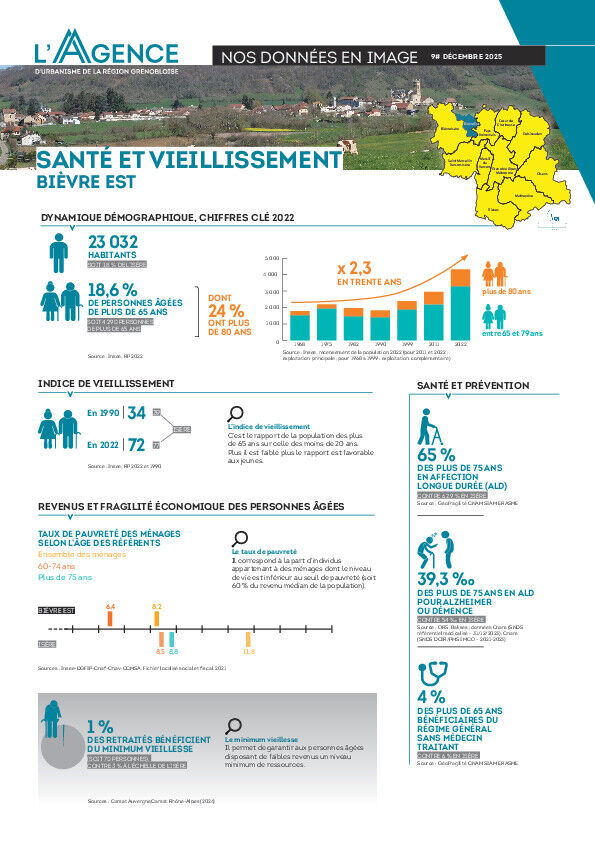Indice de vieillissement, taux de pauvreté des ménages selon l’âge des référents, part des plus de 65 ans vivant seuls, etc. Cette neuvième édition de Nos données en images dresse le portrait actualisé du SCoT, de l’aire grenobloise et des onze intercommunalités qui la composent en matière de santé et vieillissement.